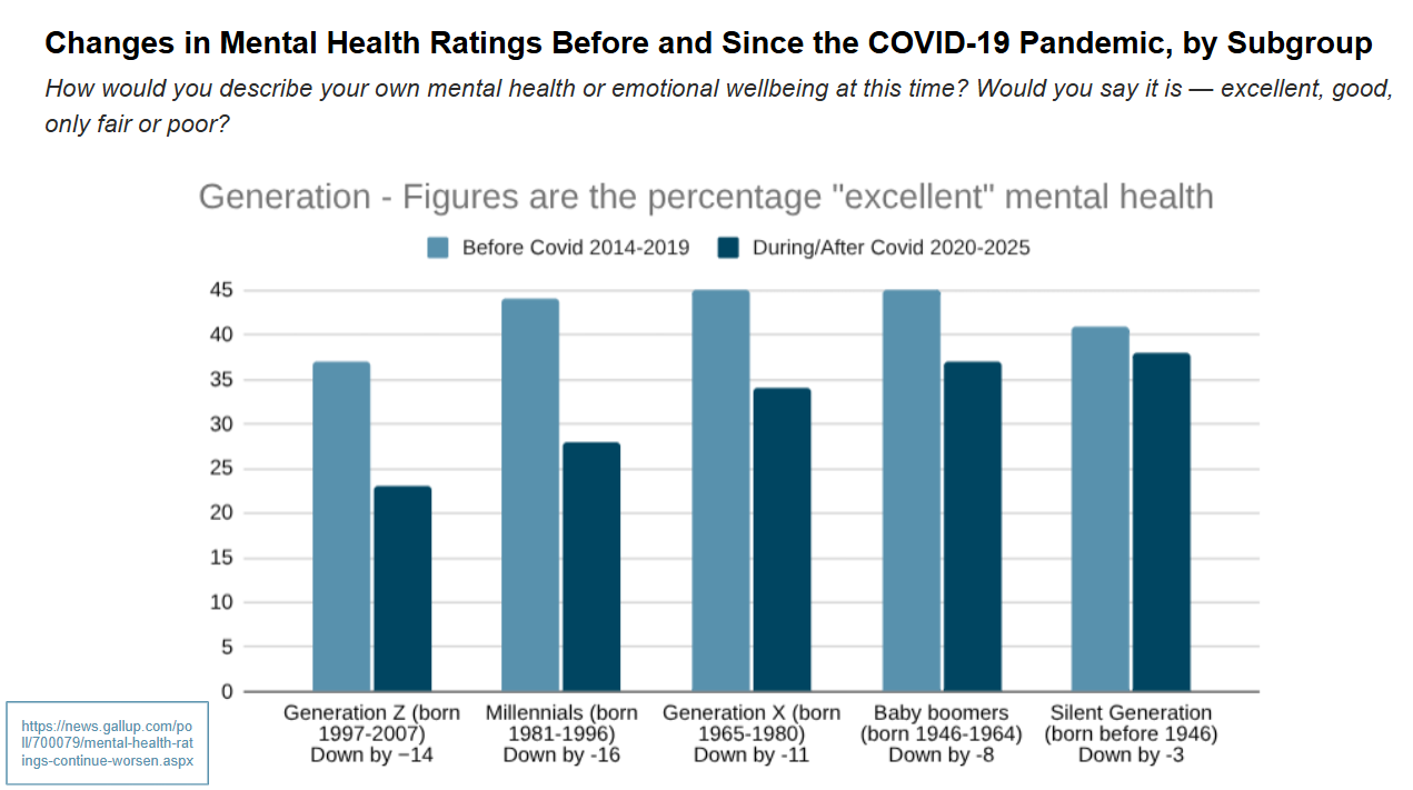 The declines show up across every major demographic group, but they’re especially pronounced among younger adults. Gen Z and millennials have seen roughly a 15-point drop in excellent mental health over the past six years. At the same time, visits to mental health professionals have increased sharply, particularly among younger generations.